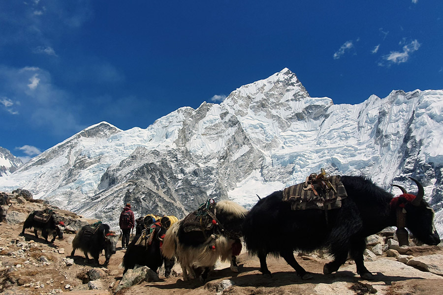 The trail for 30 minutes is easy and after a while, we climb up one short steep part. We walk on the moraine of the khangri Glacier. The way are pretty Zig Zag, we cross lots of Yaks, tourists and porters. We arrive at the "Sand lake" of Gorak Shep (5140m). We can see the good views of Nuptse(7861m), Everest (8848m), Pumari Himal(7161m). We lunch at Gorakshep and after lunch break, we go to Everest Base camp and return back to Gorak Shep for the night.